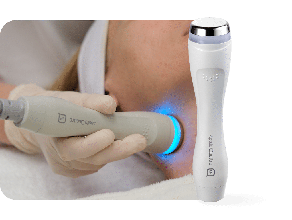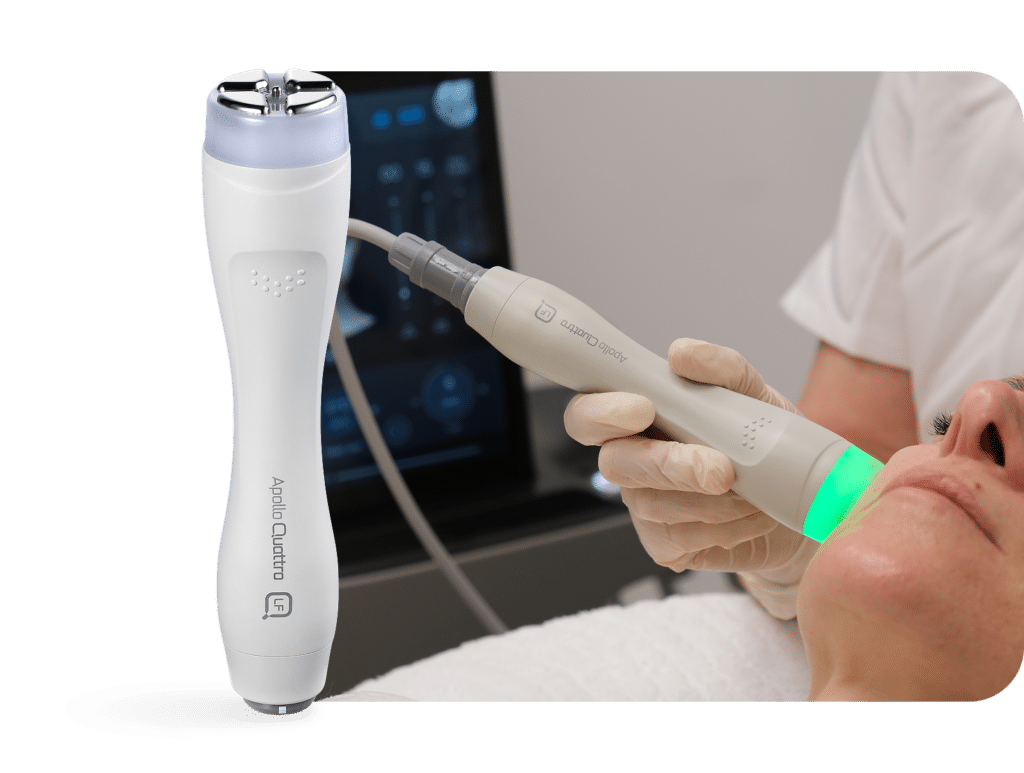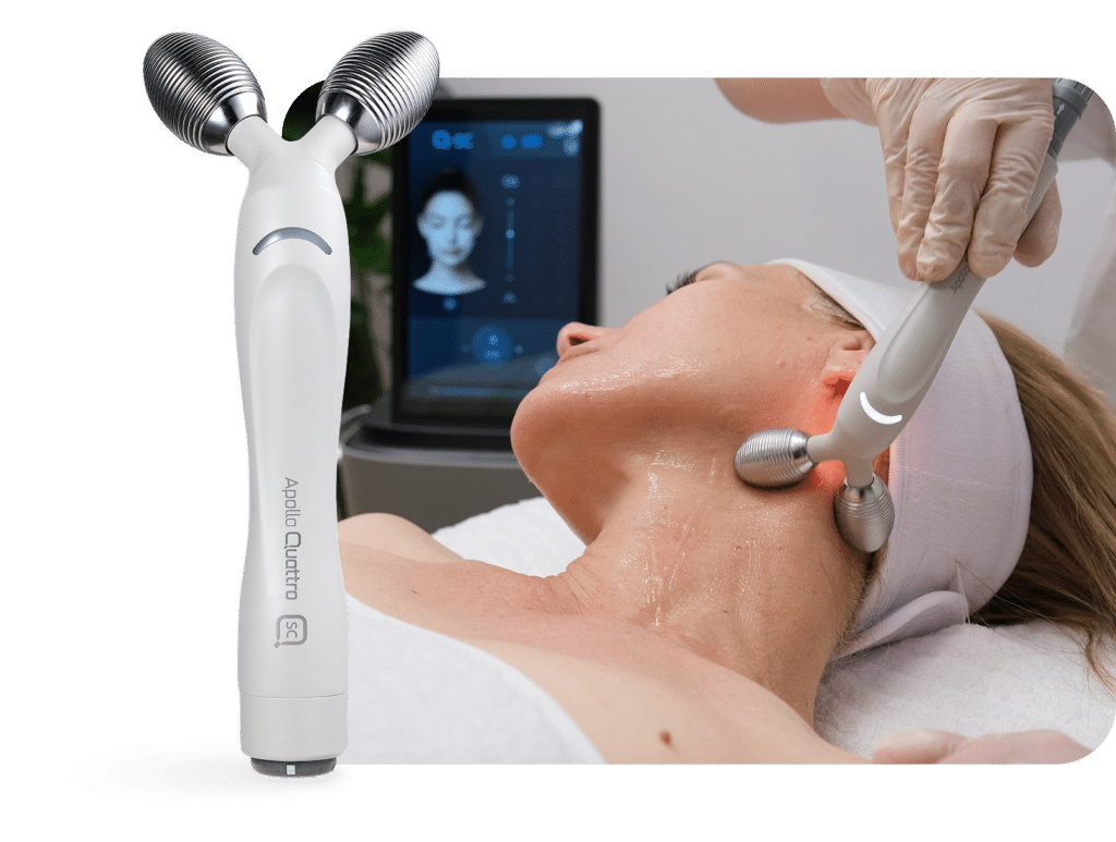 Apollo Quattro es una plataforma estética híbrida de última generación que integra tecnologías de radiofrecuencia (RF), electroestimulación muscular (EMS) y electroporación, trabajando simultáneamente en múltiples capas de la piel para lograr un estiramiento visible, una definición del contorno y un rejuvenecimiento en menos sesiones.